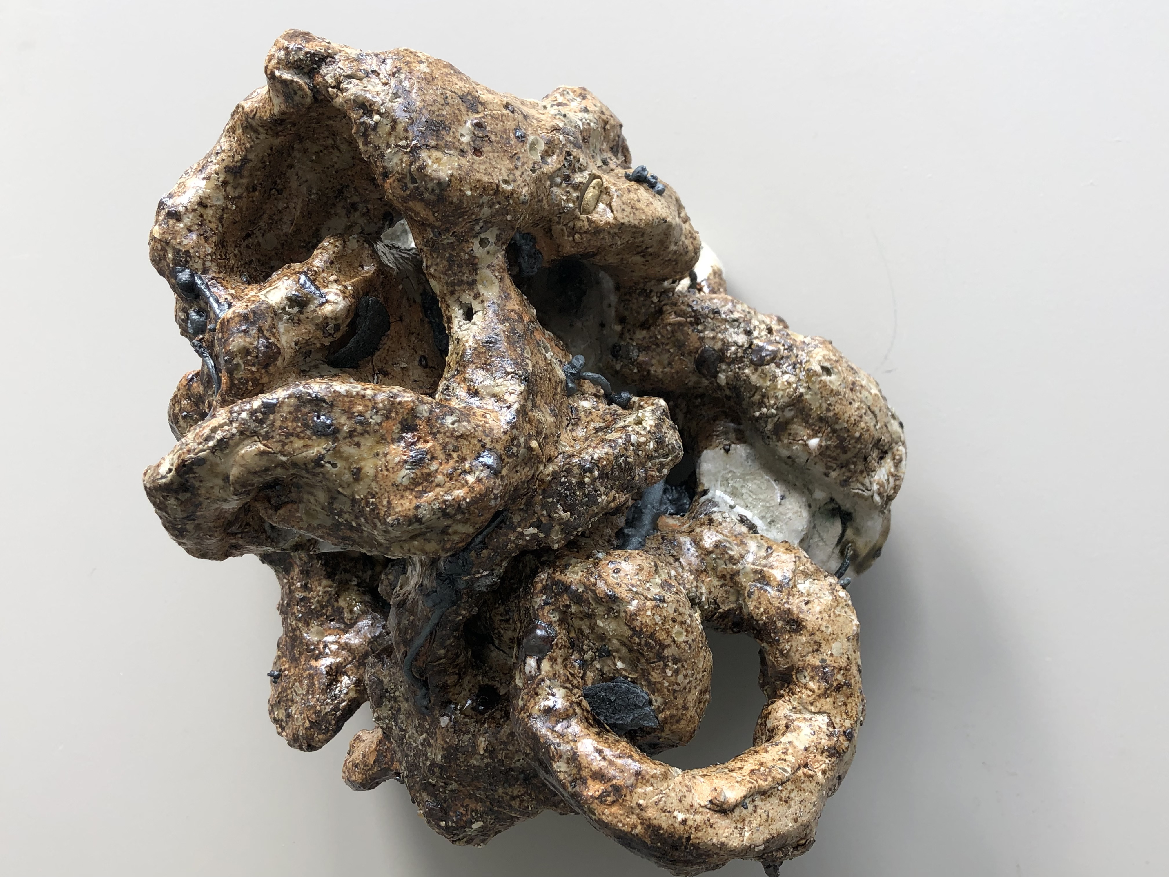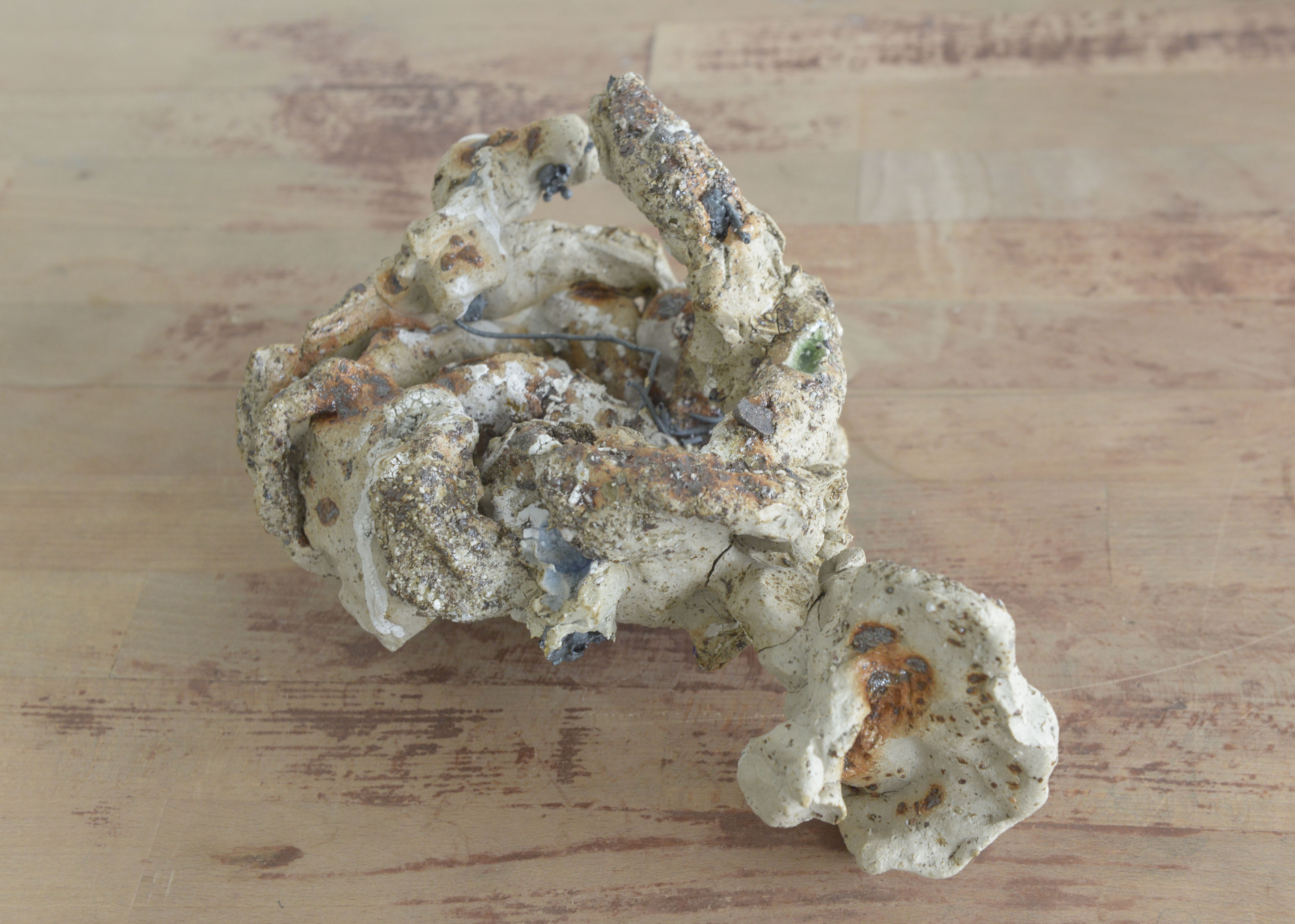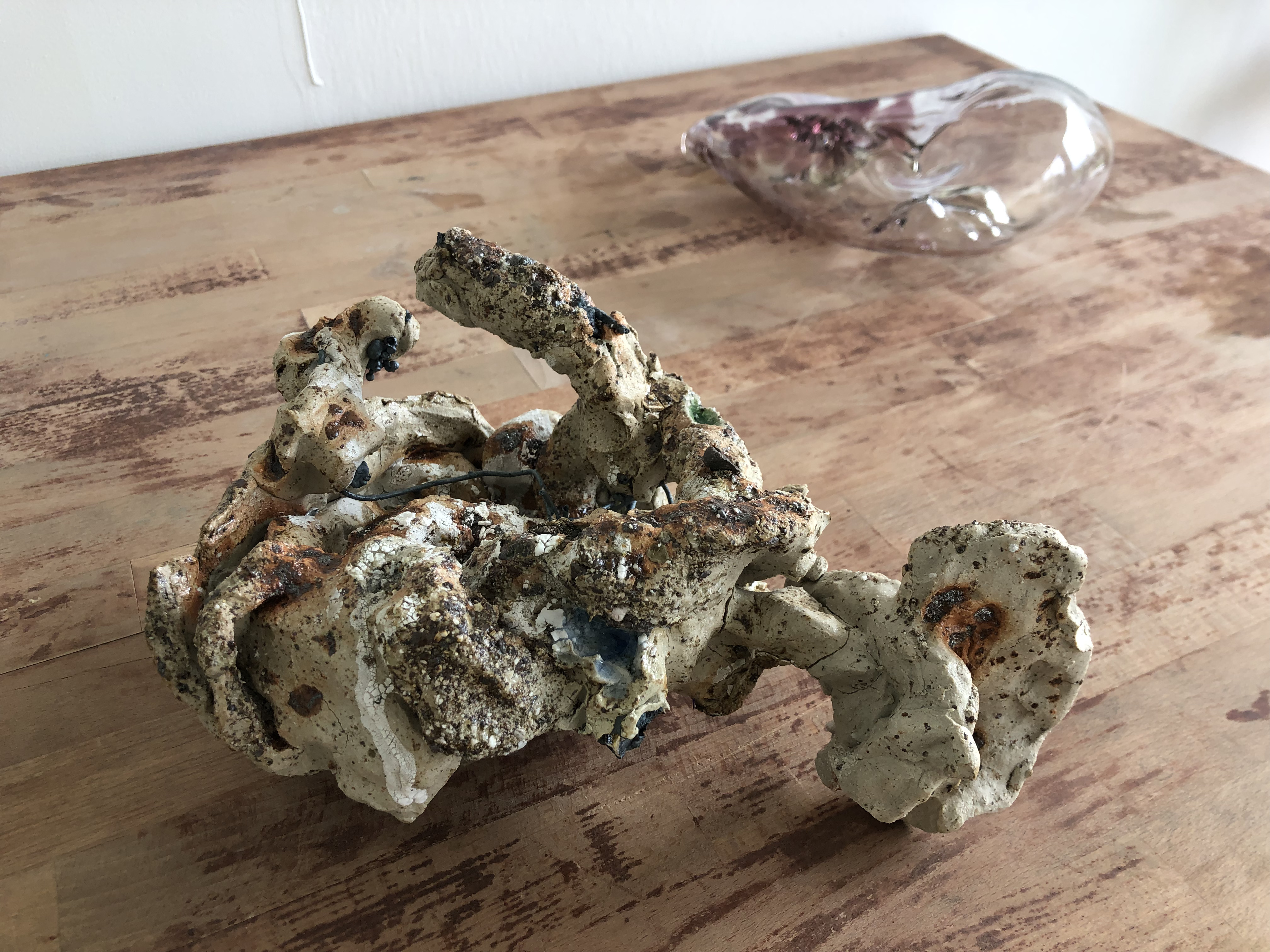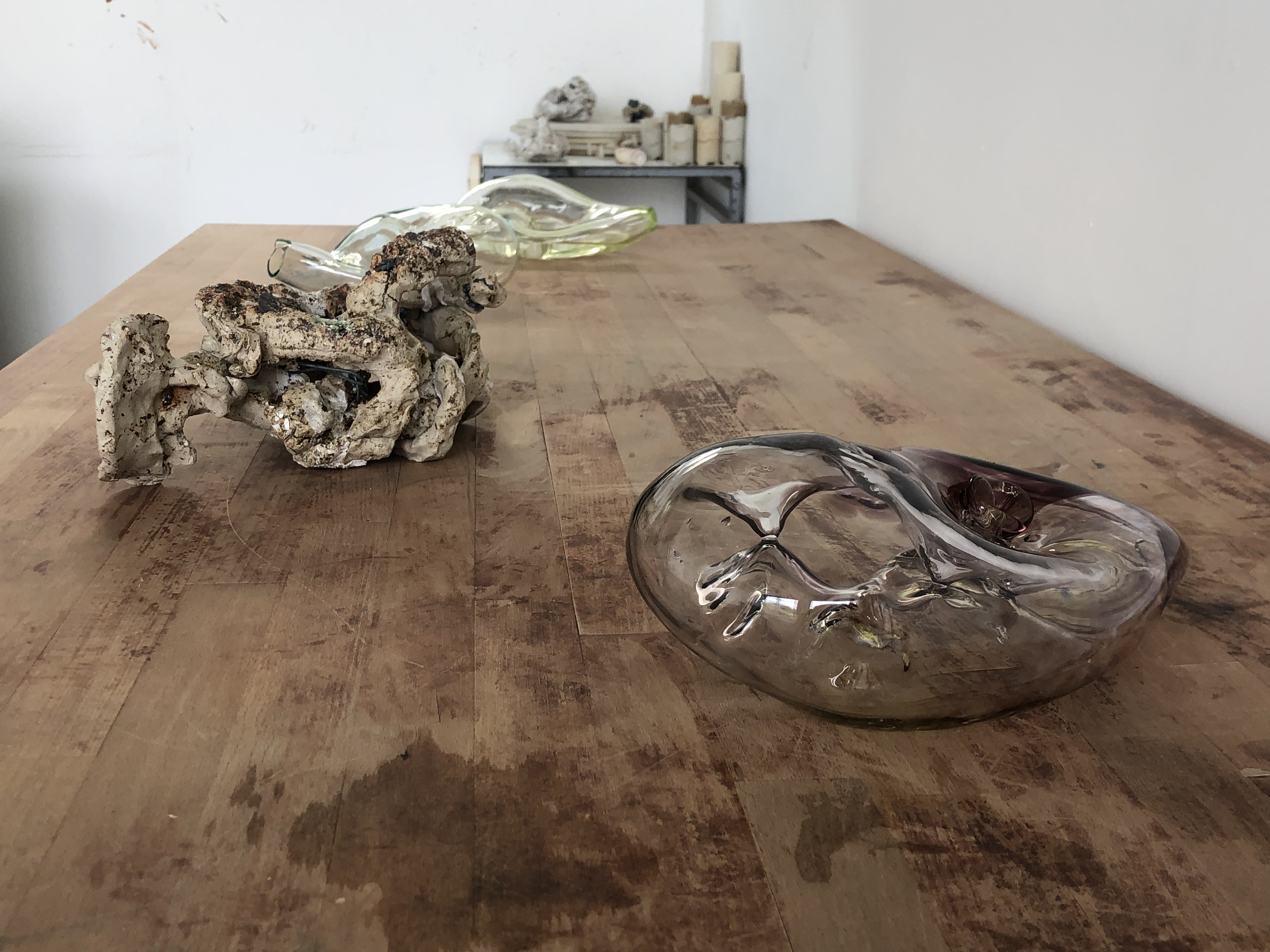 Laure’s current research on microbial memories stored in landscape and bodies raises questions about material flows, displacement and toxicity. Working in ceramics and glass, sediments from the loch have been indexed, fused or moulded with the debris of the compounds they contain, making their materiality, and for some their identity, visible through the transformation of heat. She has also experimented with a variety of glazes made from hyperaccumulator plants, a range of metals, and the remains of marine organisms. While the ceramic pieces reveal chemical residues, the glass pieces are imprints of loch waste, lost or mutagenic spaces.