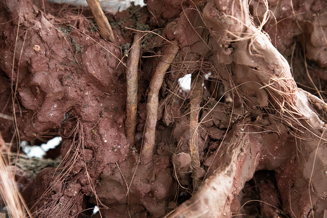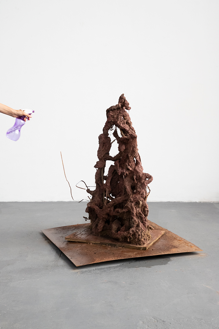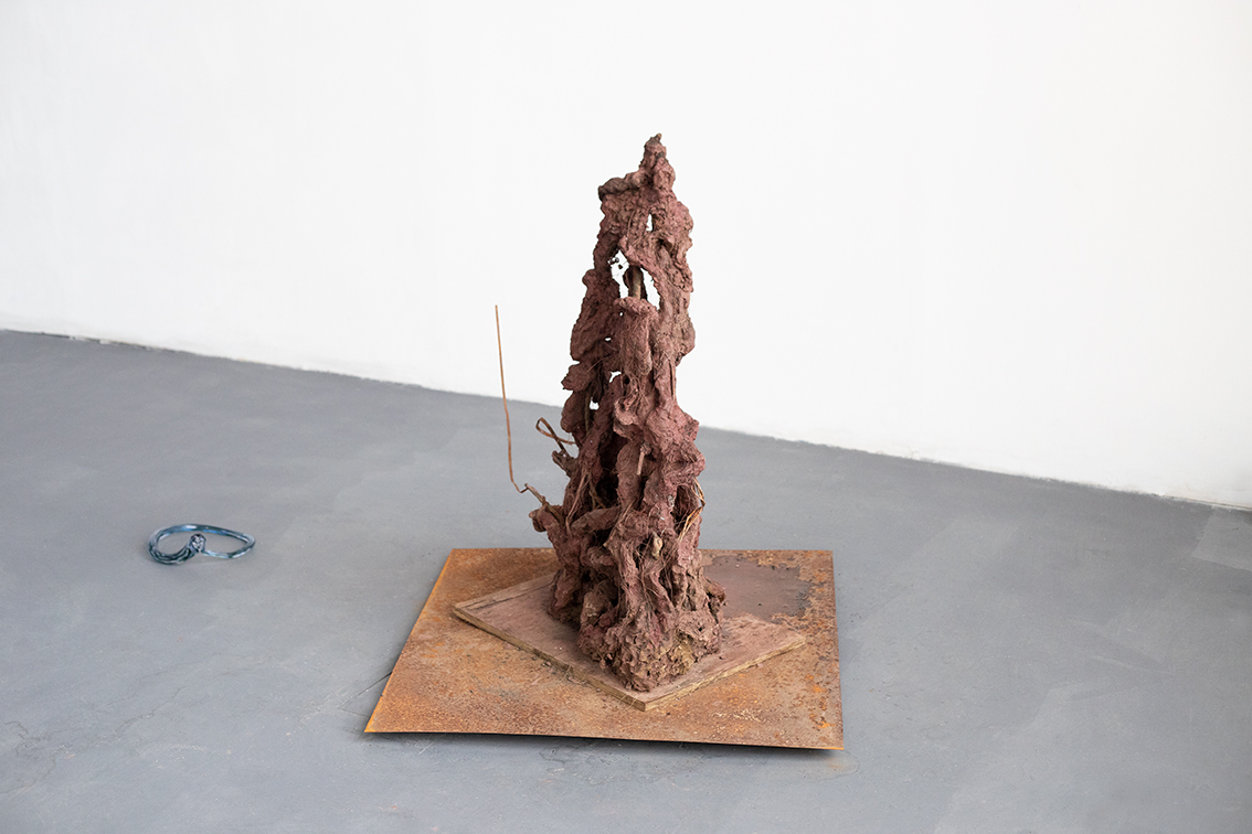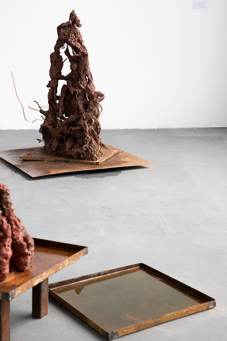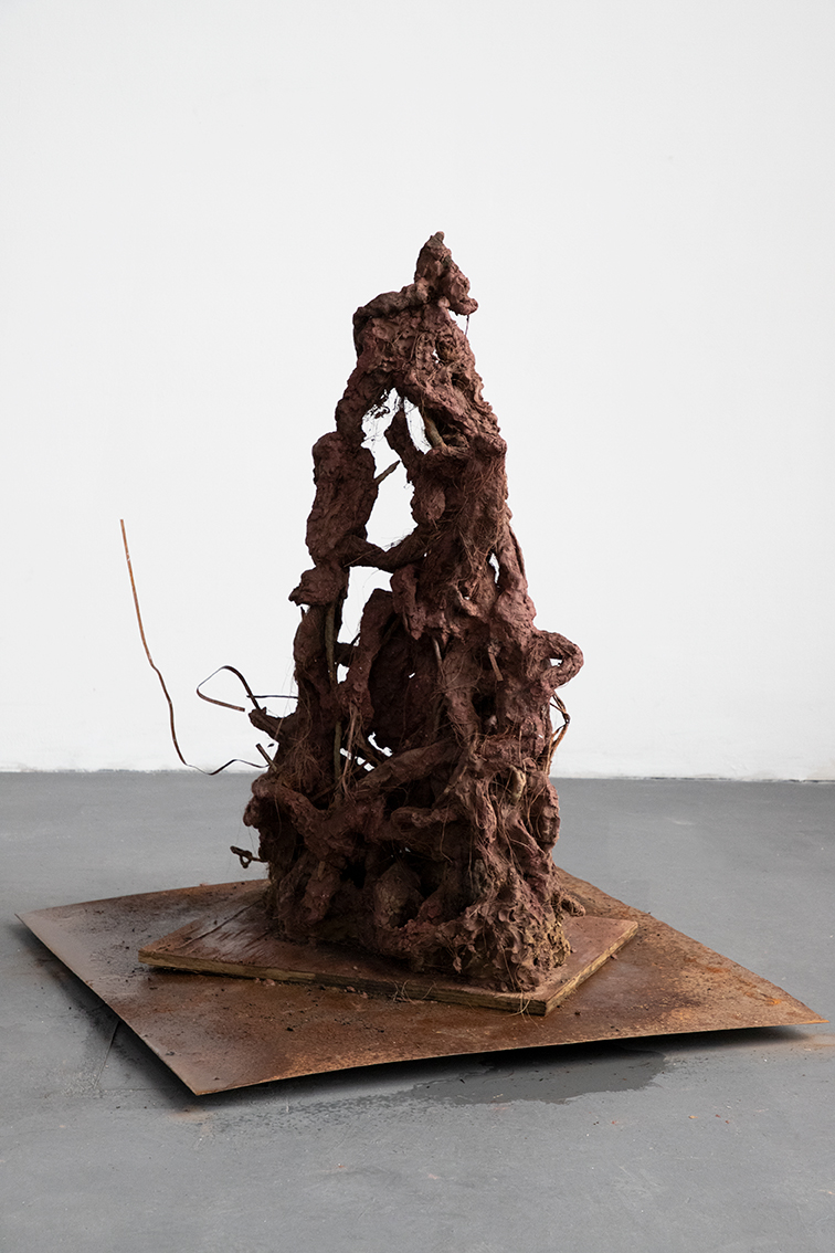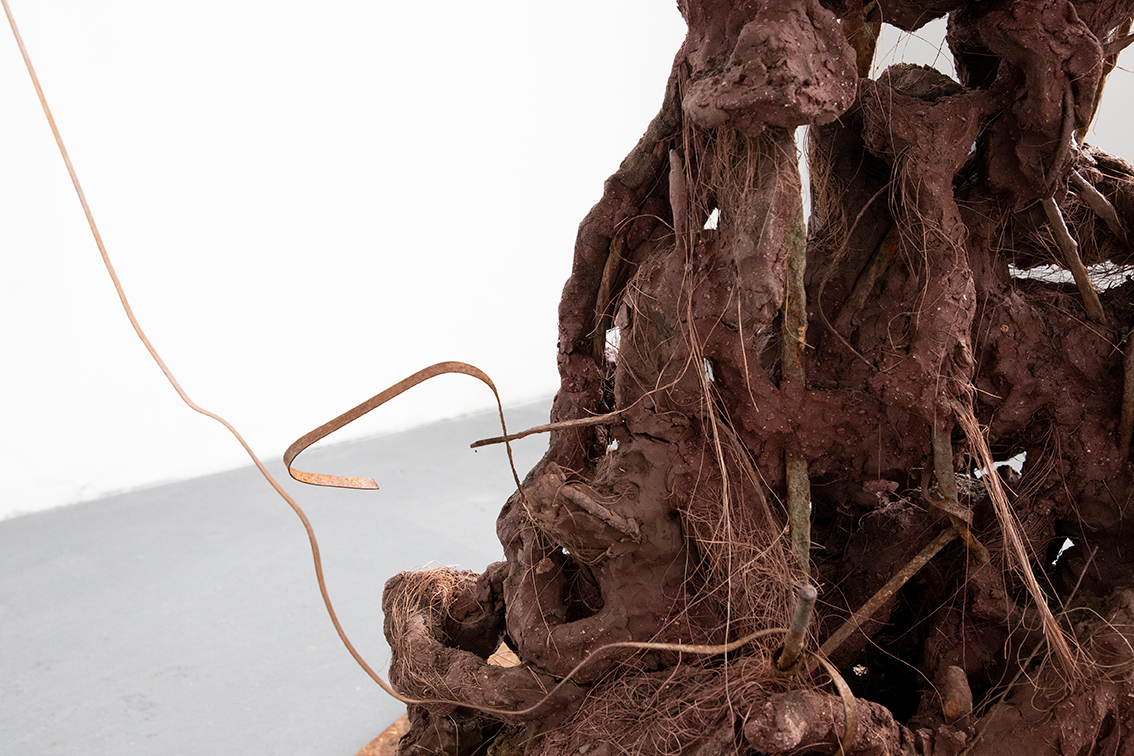 Unfired industrial stoneware, earthenware, terracotta and wild clay from London construction sites, soil from Ladywell fields, sisal, rusted steel, bacteria (iron-oxidising bacteria, campylobacter jejuni, e. coli, salmonella, shigella, staphylococcus, yersinia, ...), viruses (bacteriophages, ...) and other microorganisms, decomposed earthworms, grass, seeds, shells, moulds, microplastics, glass shards, bits of wood, sewage, oestrogens, possible traces of high levels of nitrogen and phosphorus, heavy metals