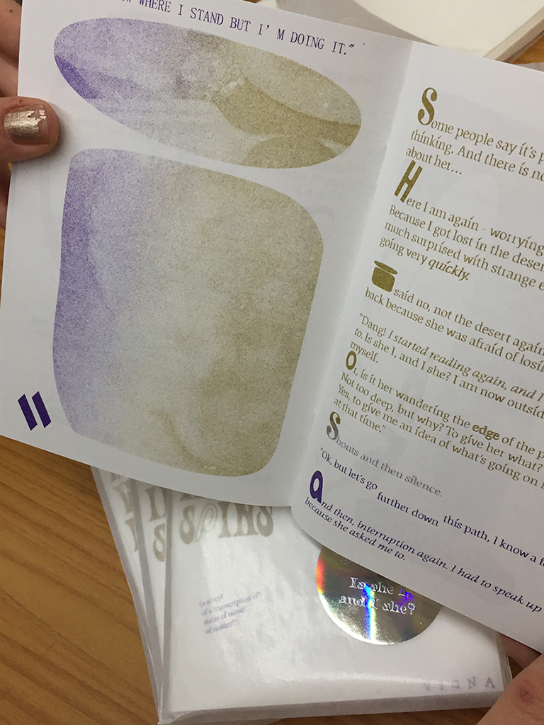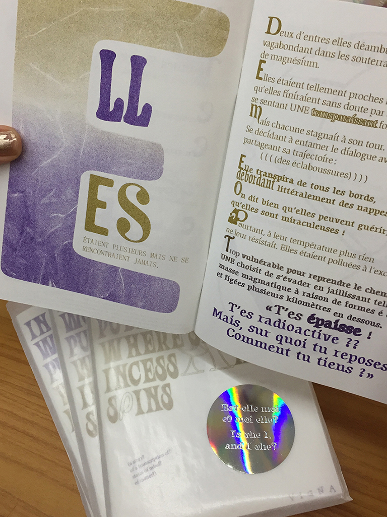 This bilingual two-booklet edition brings together short assembled texts, stories and dialogues, along with notes from news media and scientific press. Several narrators, of more or less abstract identities, alternately representing materials, sculptural forms, or myself, speak out under the effect of their emotional states. Sharing mutual spaces of words and action, they mix and merge throughout the text until they become one.